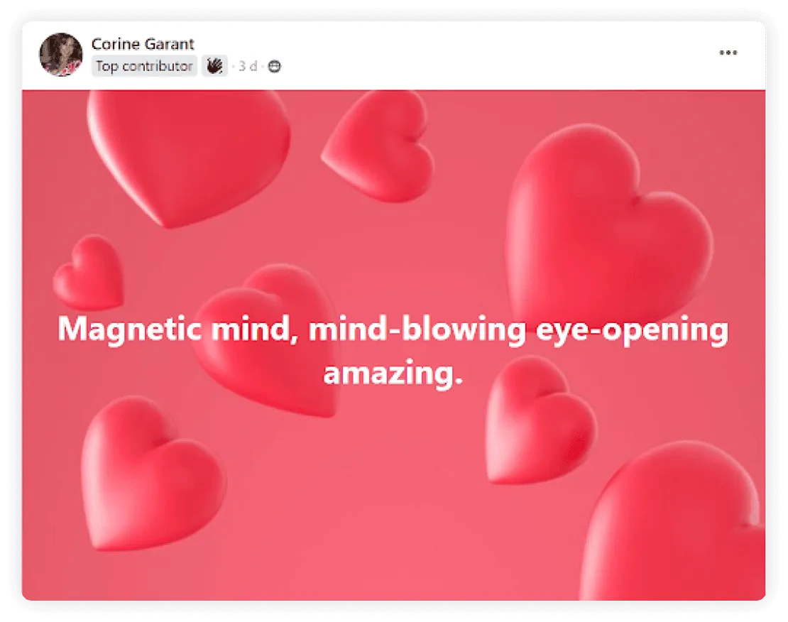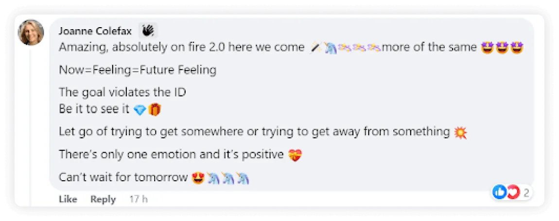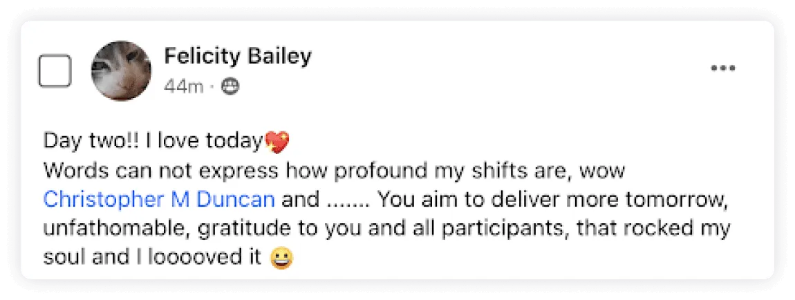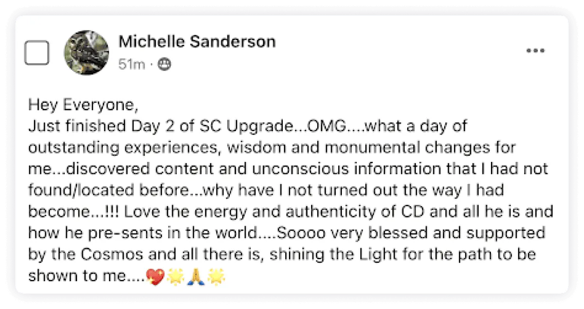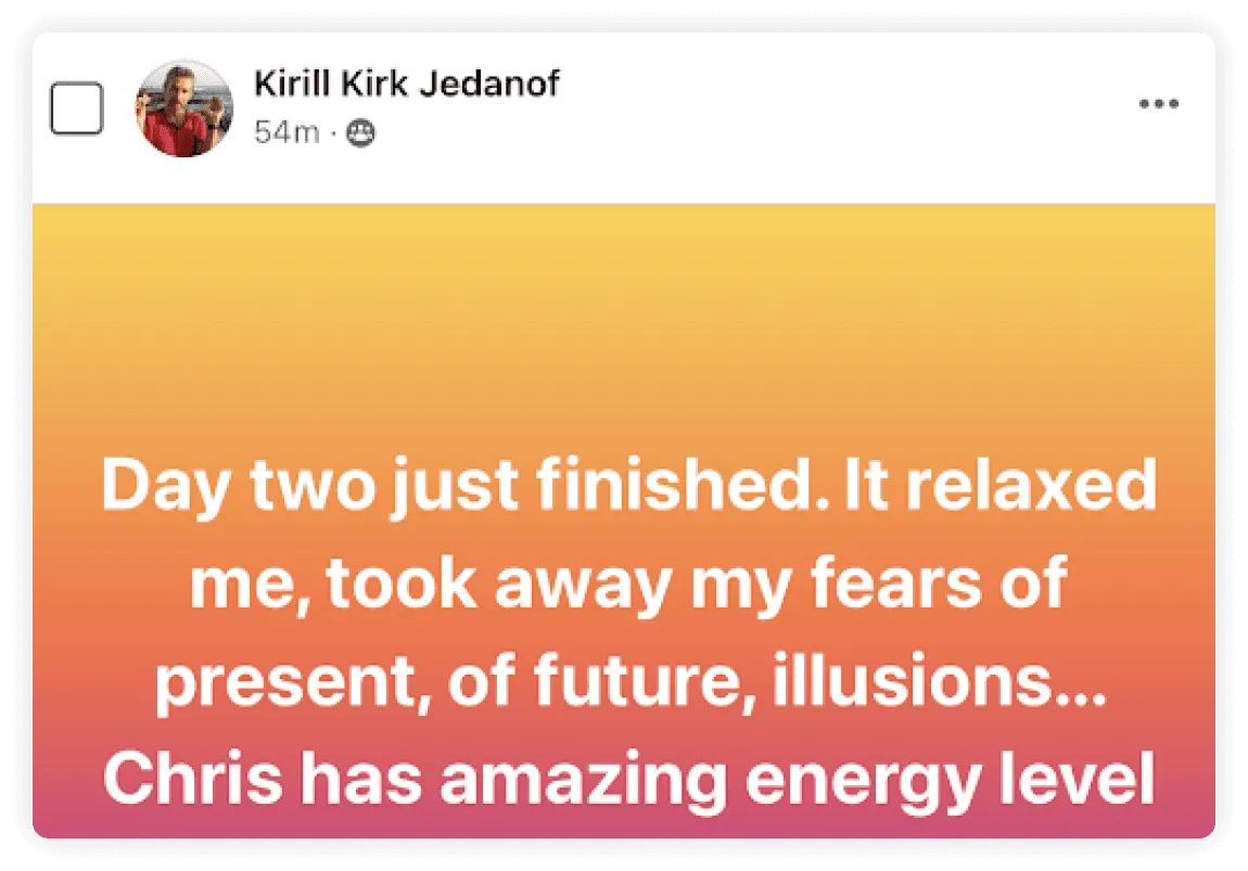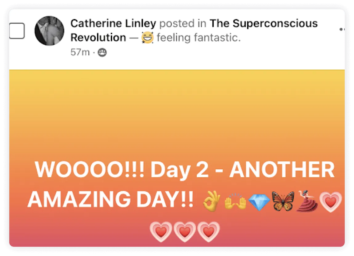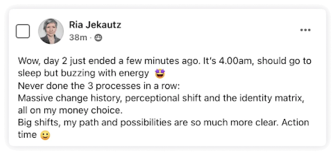 "It's been the most incredible experience in my life... getting so many benefits in my personal life, relationships, business way, enjoying life and having so much clarity with every choice I'm making everyday."
