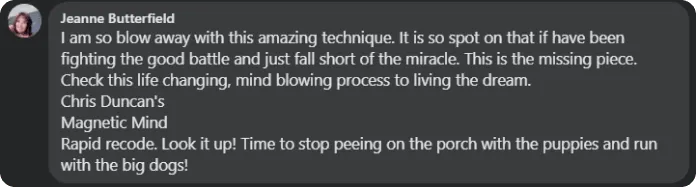 "It has been a game changer in how I deal with life and I can't wait to get the Magnetic Mind Program to others as a coach. So go fly Chris and I wish you all the luck and success in the world with this book. Thanks for all you do for humanity!"